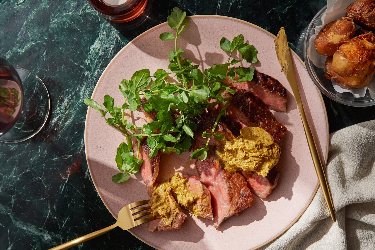 grilled ribeye steak, café de paris butter and 7 spice crispy potatoes