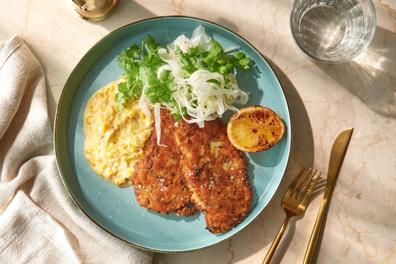 parmesan crumbed chicken schnitzel, creamed corn and fennel slaw