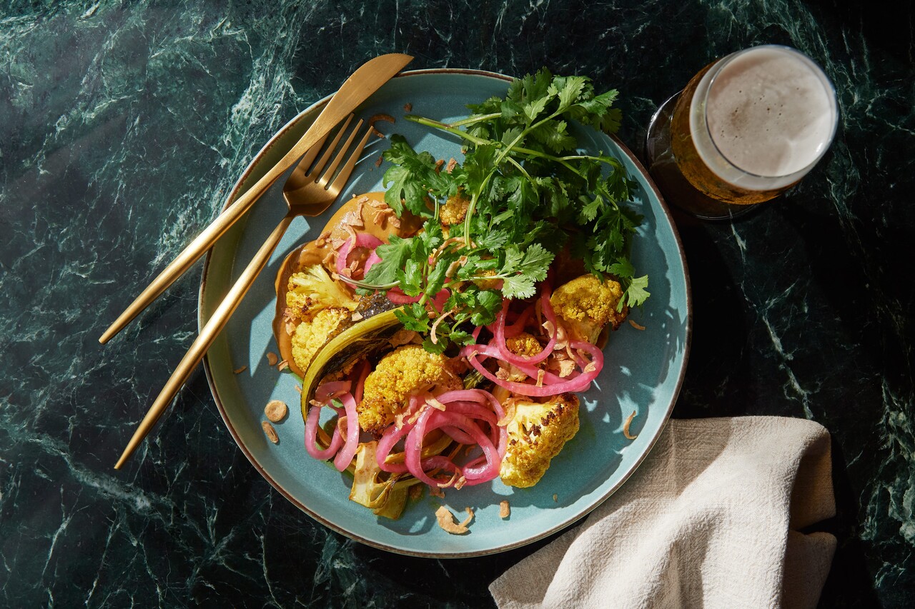roast cauliflower, cashew satay and pickled red onion