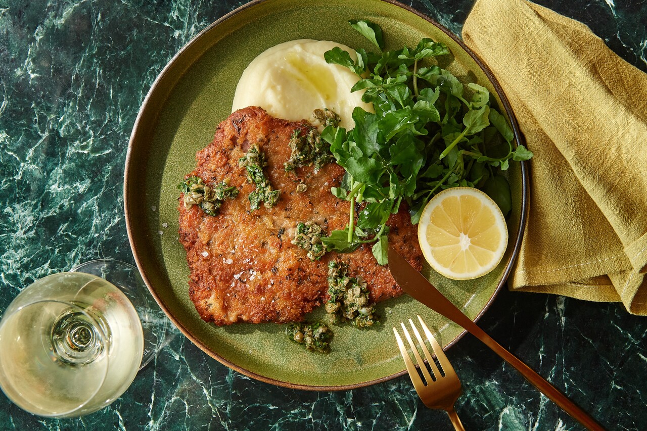 【TAKEAWAY】仔牛のシュニッツェル- ニンニクとじゃがいものピューレ“スコルダリア”、クレソン、アンチョビとレモンのドレッシング