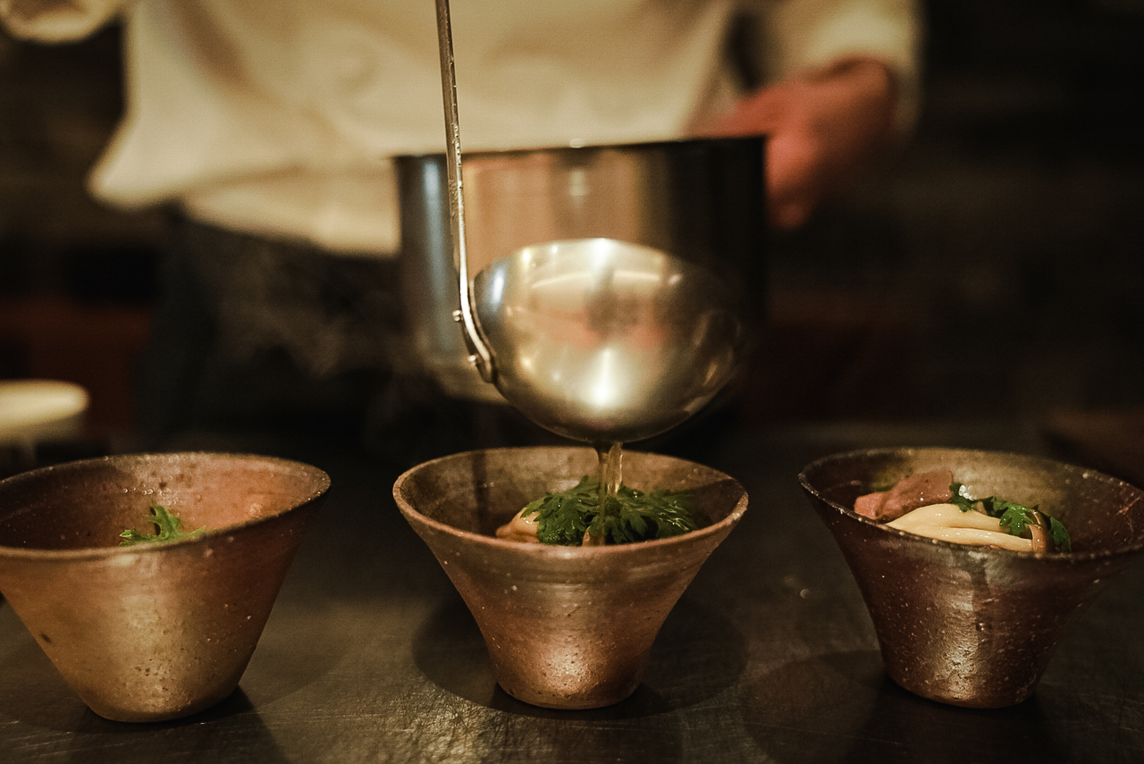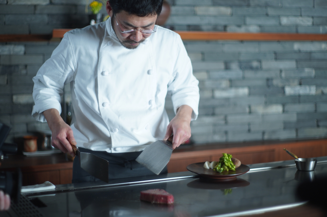 鉄板で焼き上げる黒毛和牛、季節の前菜、
