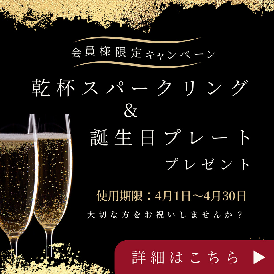会員様限定キャンペーン 使用期限:4月1日〜4月30日 乾杯スパークリング&誕生日プレートプレゼント