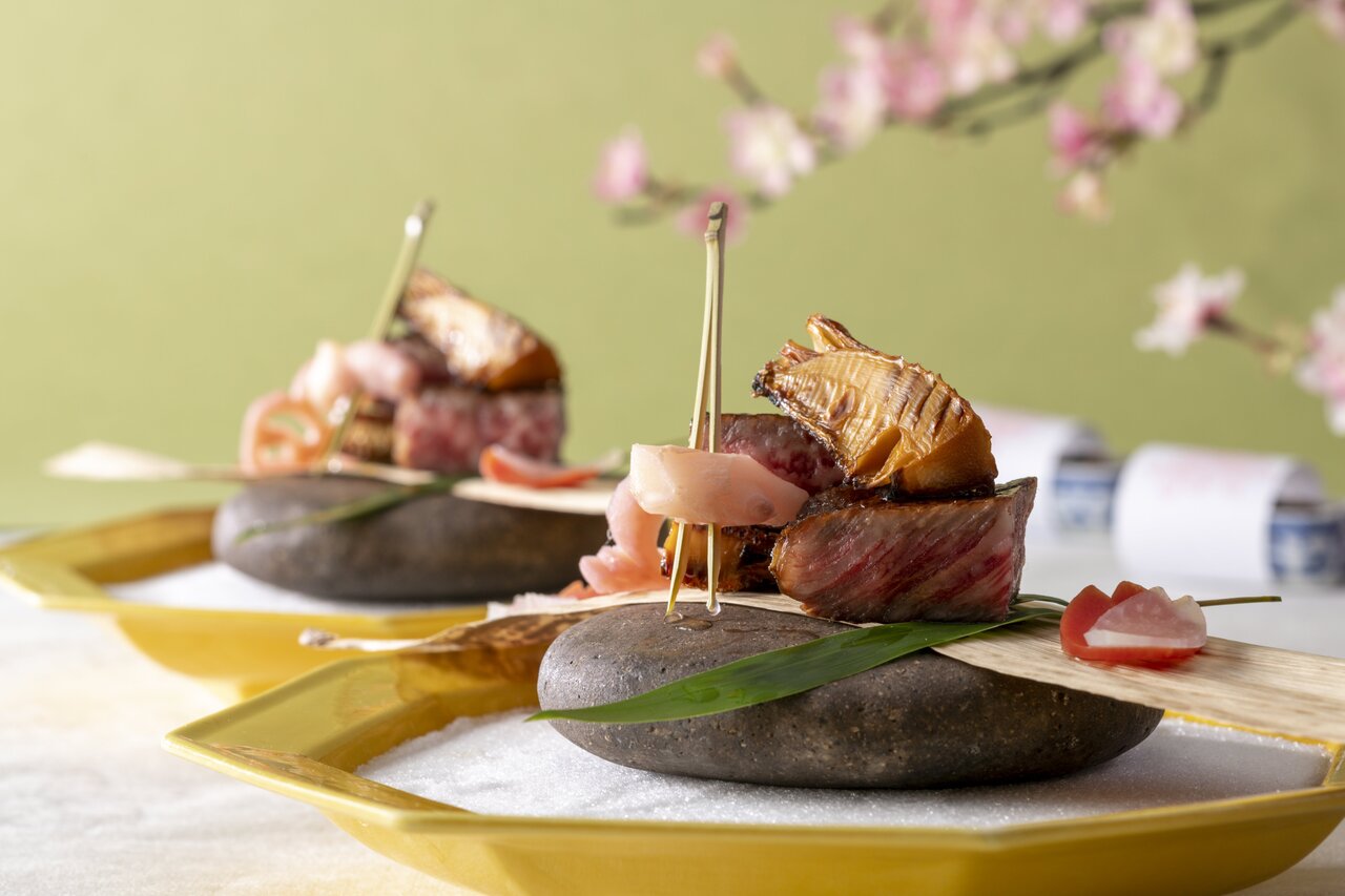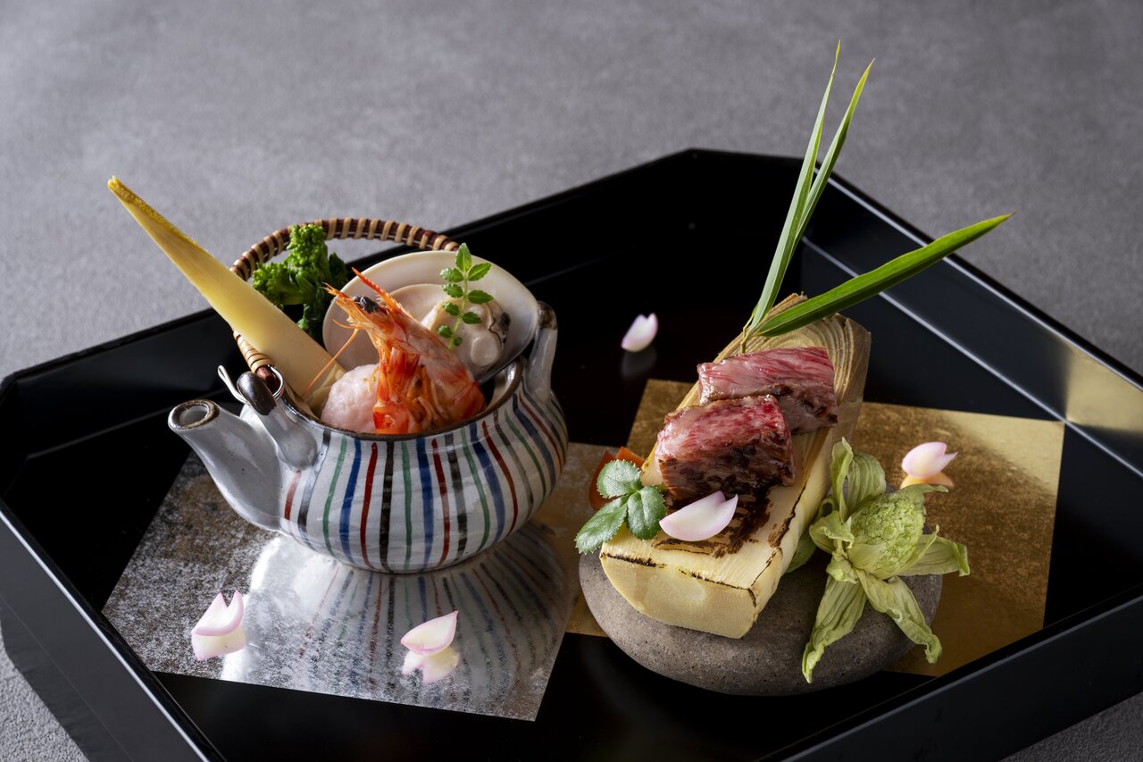 季節の食材を料理長の手技と感性であつらえた二段重スタイルに季節の一皿山菜の天ぷらと甘鯛鱗揚げがついた春を彩る懐石ランチ。