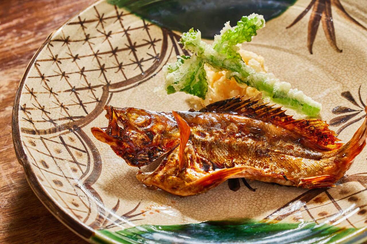 炭香る一口串焼き 鯛の白子天 鮪と大和芋