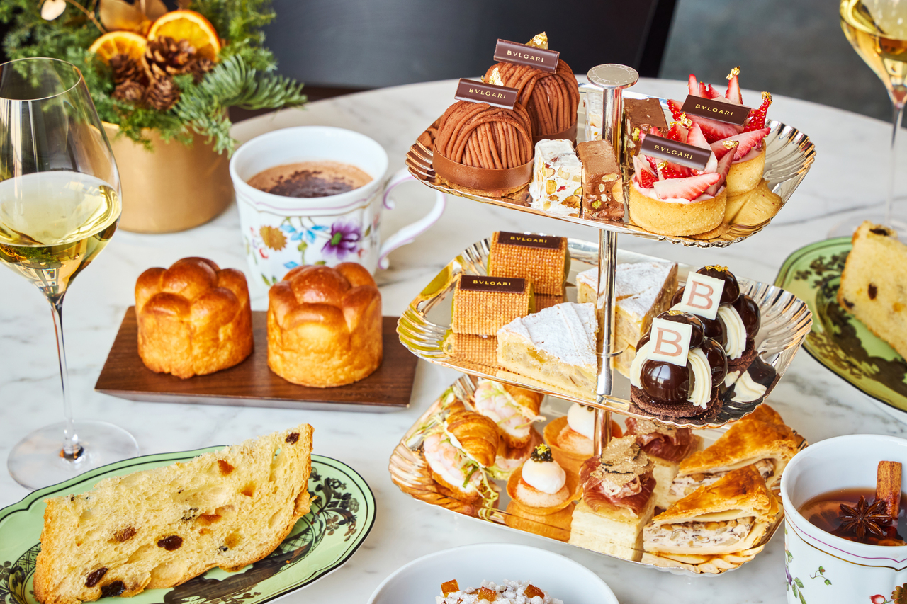 プレミアム・フェスティブアフタヌーンティーには、グラスシャンパンとブルガリ・チョコレートジェムズが含まれます。