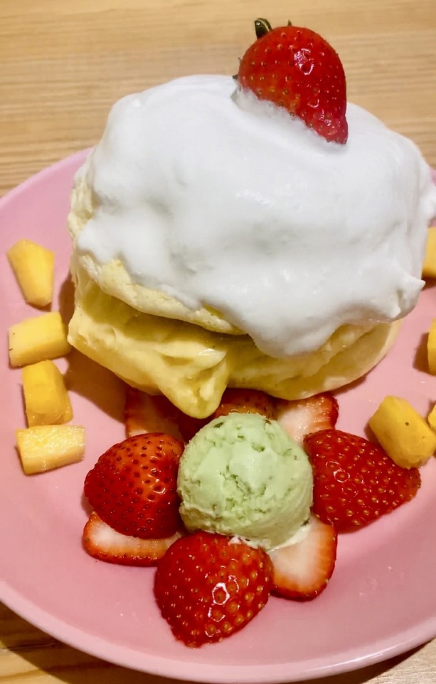 和のパンケーキ。抹茶アイス、黒蜜、きなこ、生クリーム。和みながらお召し上がりください。