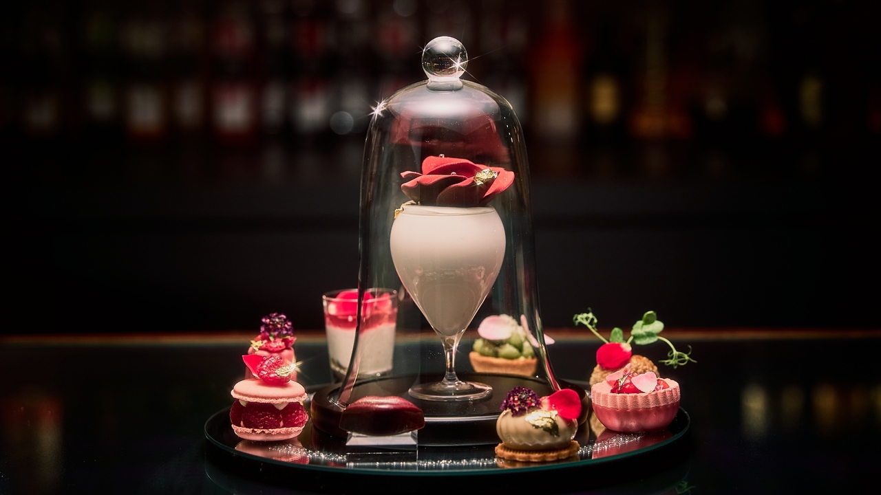 グラスの中に咲く白薔薇、黄金にきらめくマカロン、