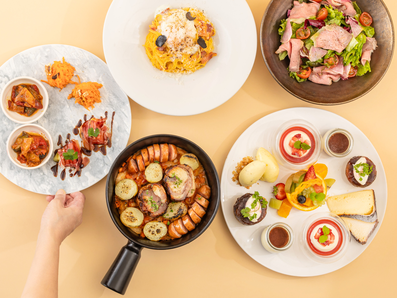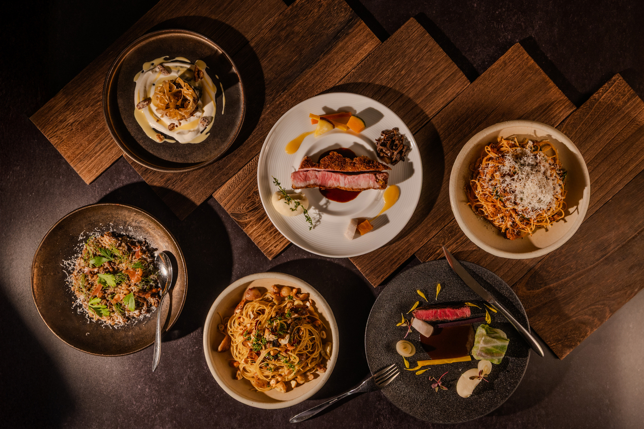 燻製した秋刀魚と栗のアーリオオーリオや、キノコの豊かな風味を存分に味わえるリゾットなど6種類のパスタまたはリゾットからお好きな1品をお選びください。前菜3種盛り合わせ&スープ、本日のデザート付。