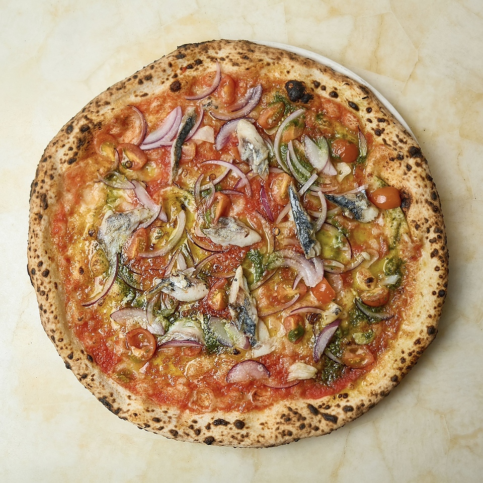 コンフィした鯖を使ったアラビアータ風ピッツァ!しっかりと辛いです!