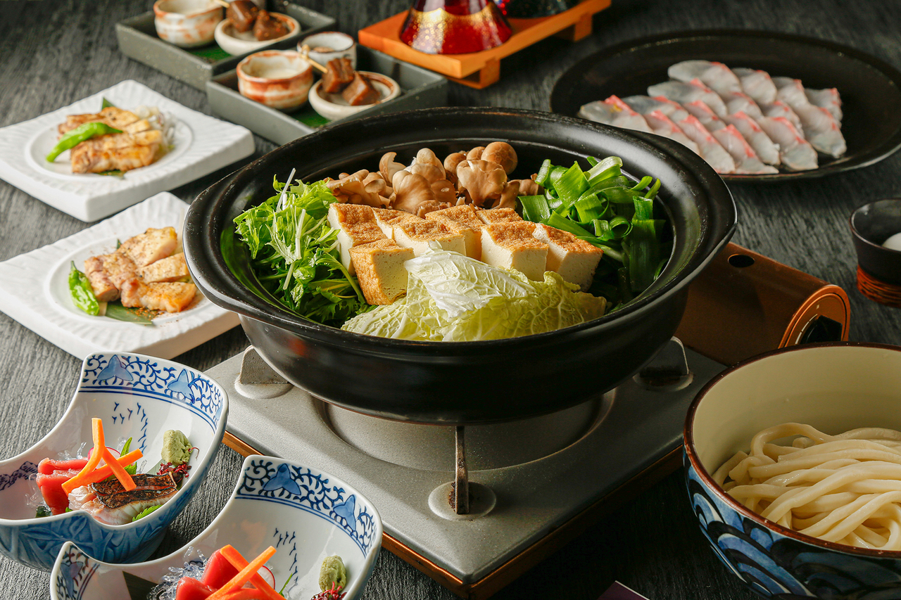 忘年会2025【冬の宴席】2名様~飲み放題プラン★寒ブリしゃぶしゃぶ鍋と〆は自慢のおうどんの宴席スタンダードコース★