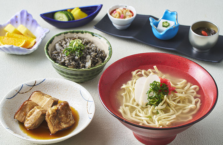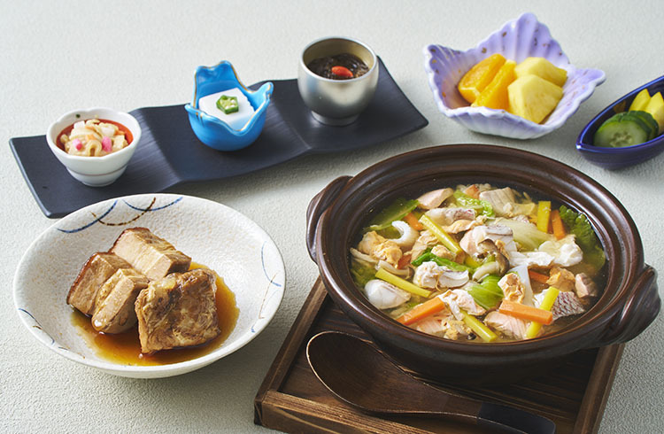 琉球泡盛でじっくり時間をかけて煮込んだ軟骨ソーキやラフテーの他、イカ、豚肉、たけのこをイカ墨の濃厚な旨味を加えた沖縄の郷土料理「ジューシー」をセットで楽しめる御膳です。