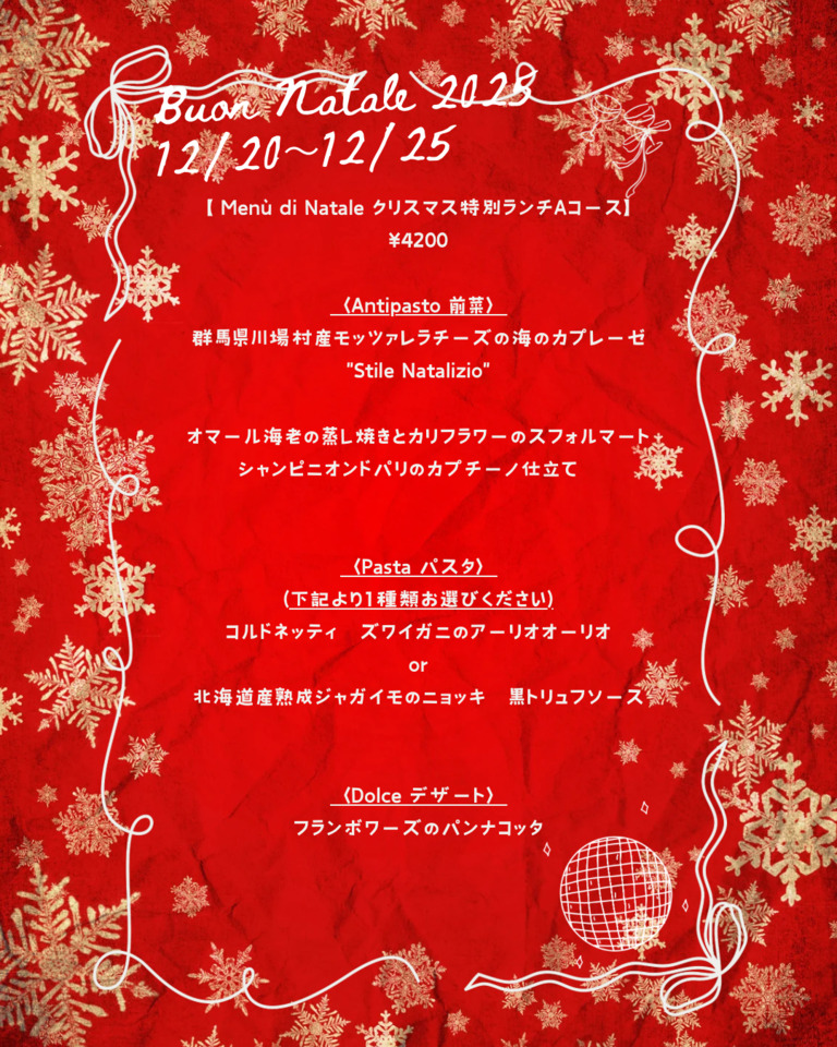 12月20日〜25日までクリスマス限定で特別コース(¥11000)もしくはクリスマス限定アラカルトメニューをご提供させていただきます(2時間制)