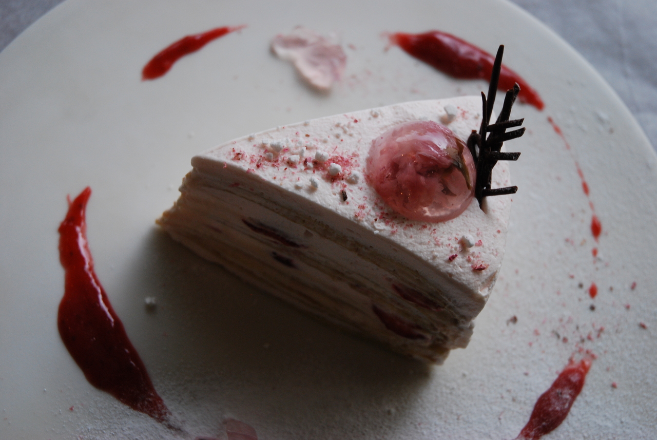 桜葉を加えたクレープに、桜のクリームとジュレ、苺のカスタード、フレッシュの苺。