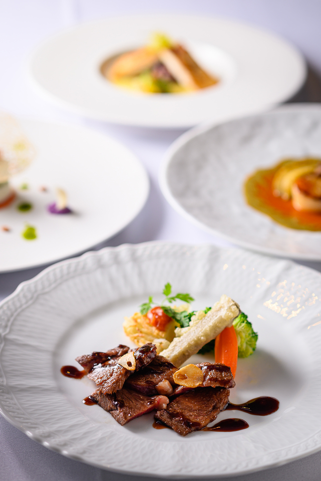 旬の野菜、漁港直送の魚介をつかったアミューズ、ルスツポークの一皿や手打ちそばがセットされた創作フレンチ。