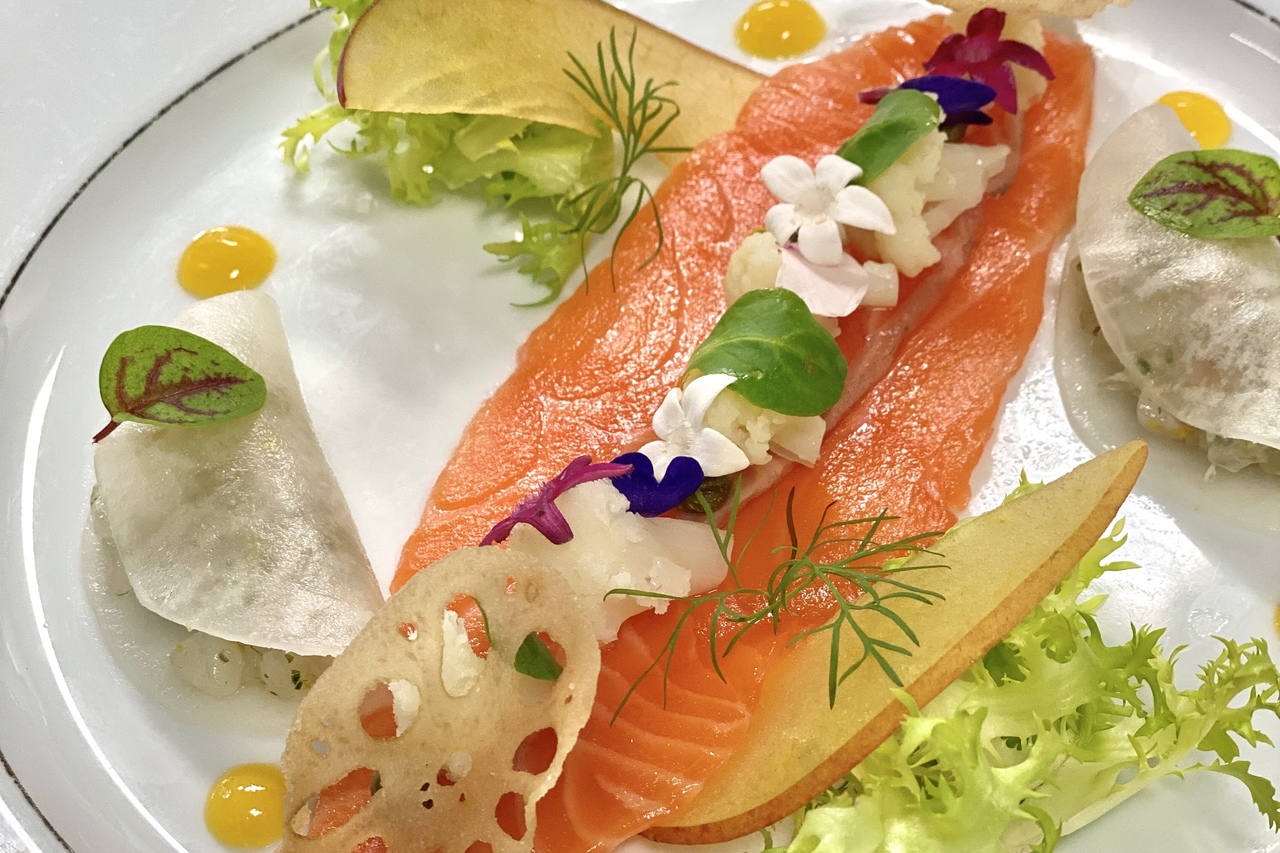 ノルウェーサーモンのマリネ 小蕪とリンゴのスライス