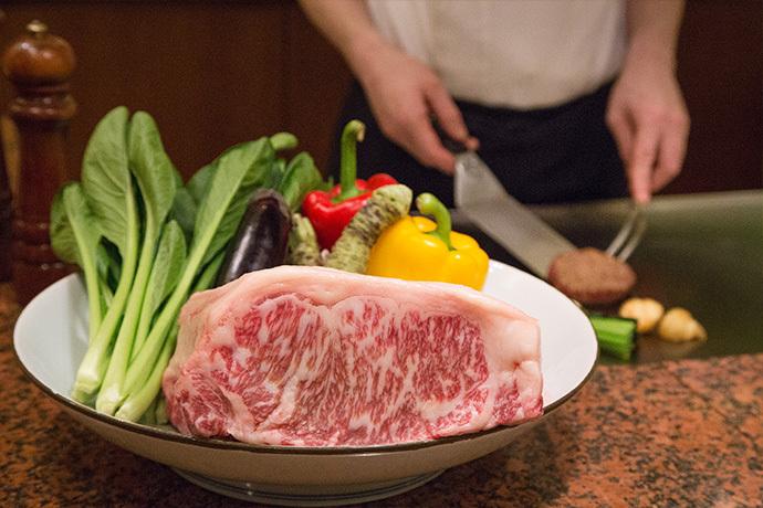 【ランチ&ディナー】「静岡そだちロース」と「黒毛和牛フィレ」、フォワグラや焼き野菜など、目の前の鉄板で焼きあげます。