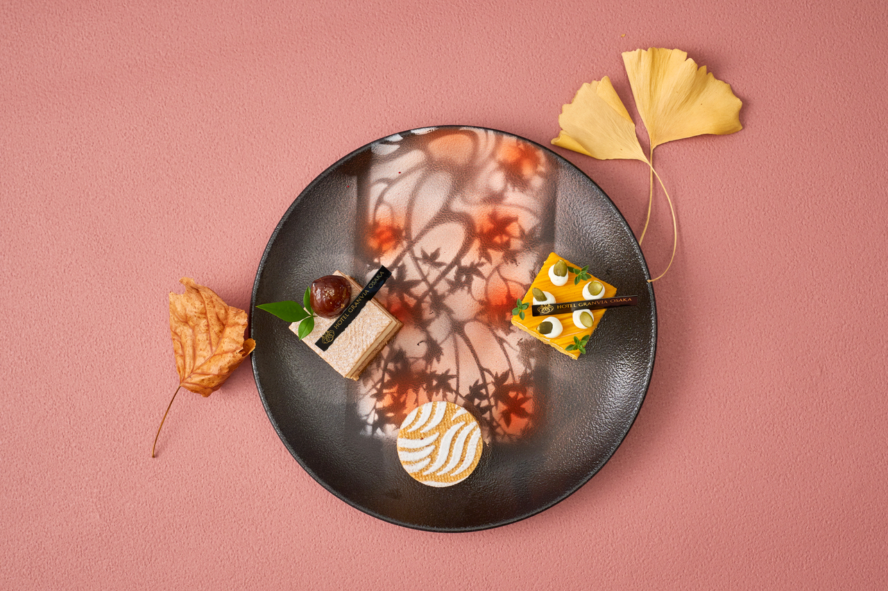 スイーツプレートのデザインは、紅葉柄でご用意します。