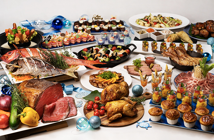 クリスマスシーズンならではの「ローストチキン」や「宮古牛のローストビーフ」は、ショーキッチンでシェフが目の前で切り分けてご提供。さらに「沖縄県産和牛のパイ包み焼き」や、多彩なスイーツもご用意しております。