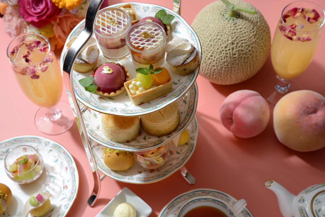 旬のフルーツ「ピーチ×メロン」を使用したアフタヌーンティーセット。スイーツはもちろん、セイボリーにも桃とメロンを取り入れ、爽やかでみずみずしい夏を演出。