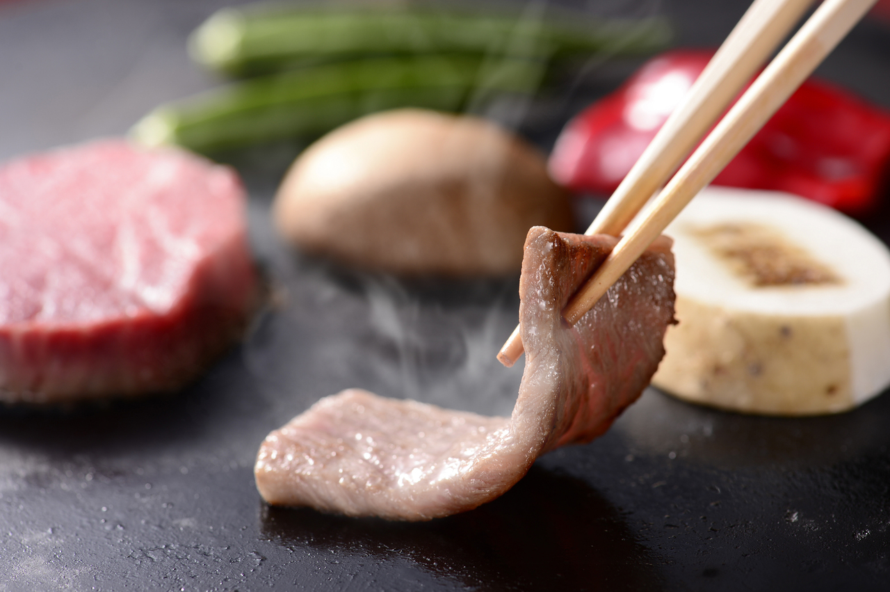 石焼料理 木春堂はお客様のテーブルに備え付けの富士山の溶岩石の上で