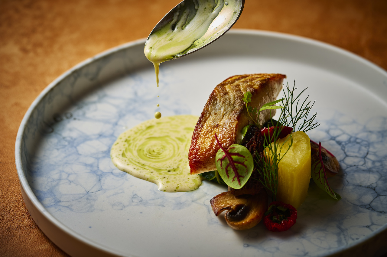 【魚料理】沼津港桜鯛のヴァプール 山菜のピューレと蛤のジュのサフランソース