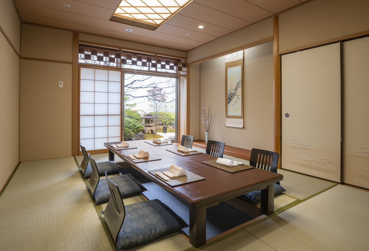 窓付き完全個室、掘りごたつの和室。庭園がよく見えます。