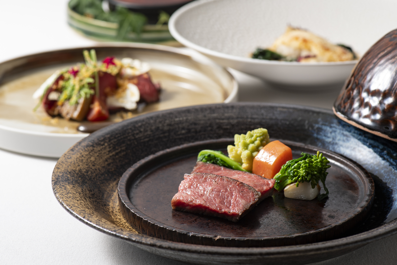 フランス料理の伝統に和のエッセンスを掛け合せた、個 性的な「京フレンチ」をご提供します。調味料から野菜 まで地元食材を取り入れるとともに、シェフおすすめの上 質なお肉料理からお酒に合せるおつまみメニューなどを 様々なシーンでお楽しみいただけます。