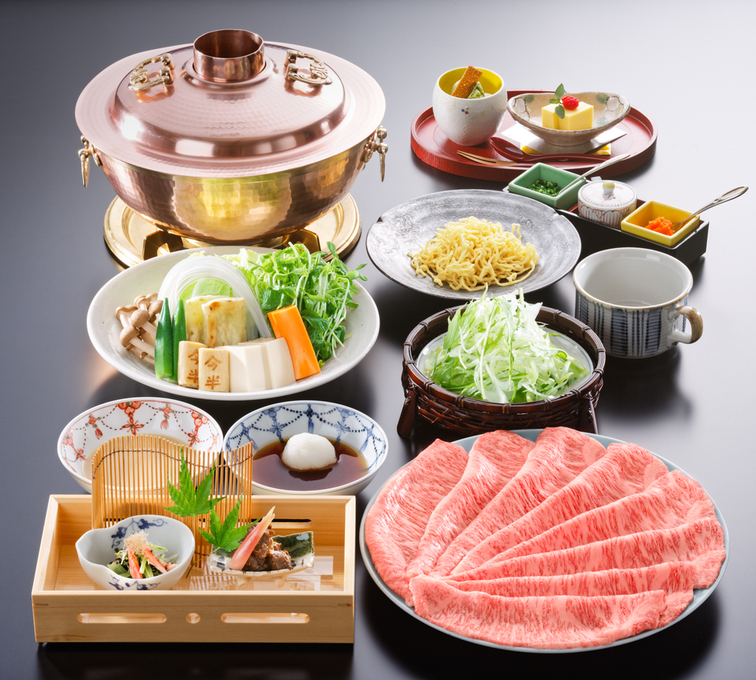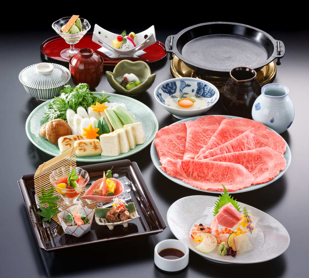 前菜(ローストビーフ握り寿司入り)・お造り・すき焼・食事・デザート