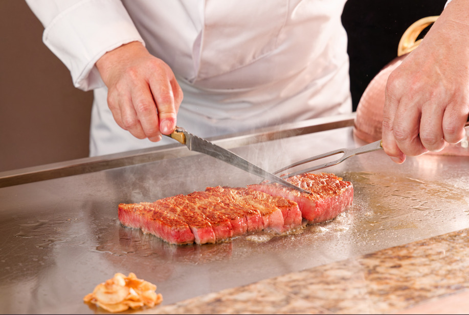 座付・前菜・お吸い物・ローストビーフ握り・魚介焼またはフォアグラの鉄板焼・サラダ・焼野菜・ステーキ・お食事・甘味・お飲み物