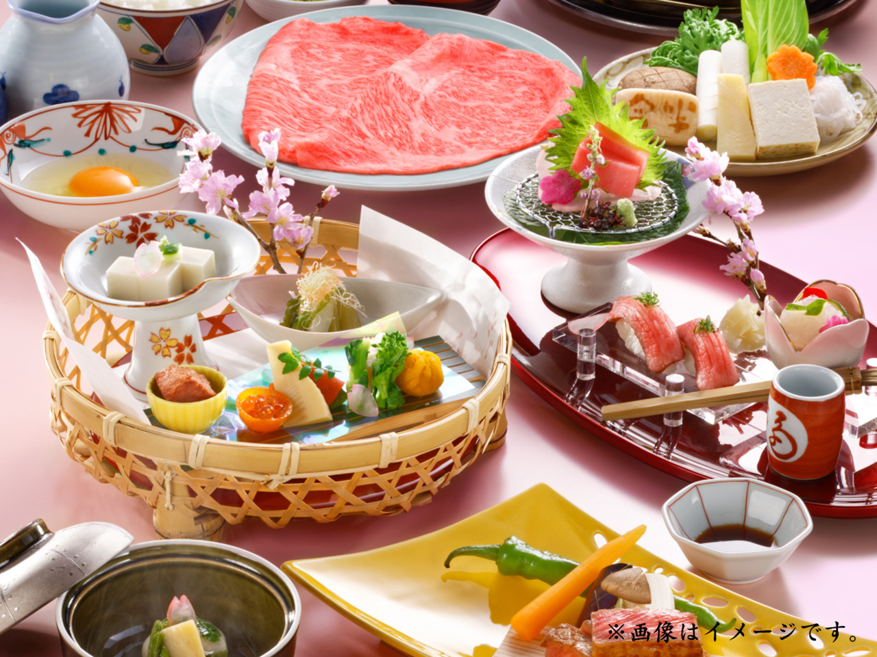 すき焼又はしゃぶしゃぶと、ステーキ、ローストビーフ握り寿司といった人形町今半自慢の黒毛和牛料理と旬の味覚を取り入れた贅沢なコースです。