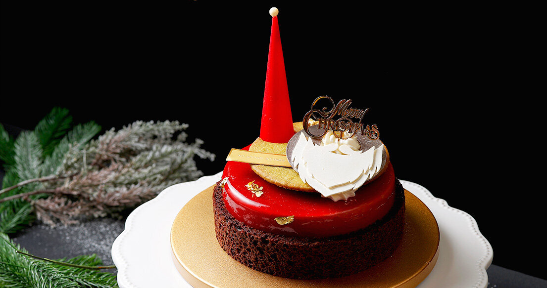 真っ赤なグラサージュに包まれた華やかでスタイリッシュなケーキ。