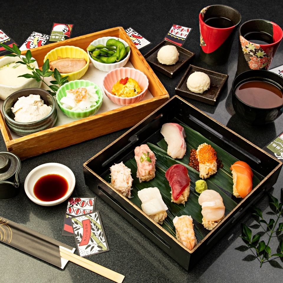 ★土日限定ランチ★乾杯1ドリンク付き★【京都の街並みで味わうランチ御前】おばんざい5種盛合せと9種お寿司のお寿司御膳
