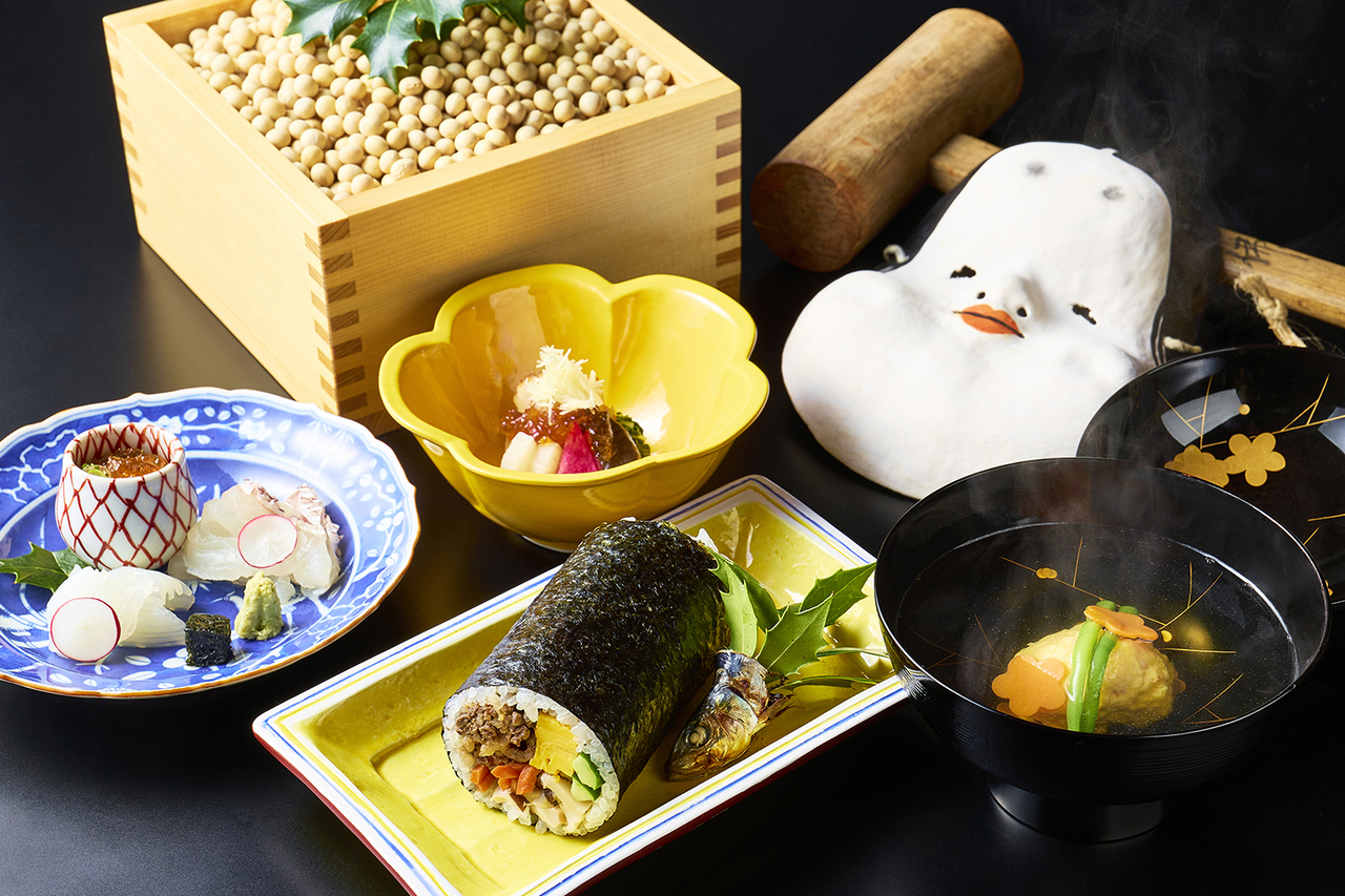 節分の日に合わせ、親子でお餅つきや恵方巻を巻く体験をしていただきます。つきたてのお餅はその場でお召し上がりいただき、巻いていただいた恵方巻はお料理のコースの中に使用します。また、当日の料理内容は以下のとおりです。