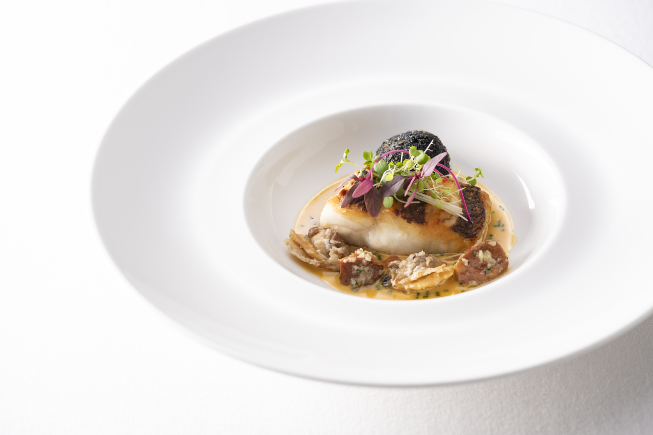 ・サーモンムニエル 栗と茸のリゾット 白ワインのソース
