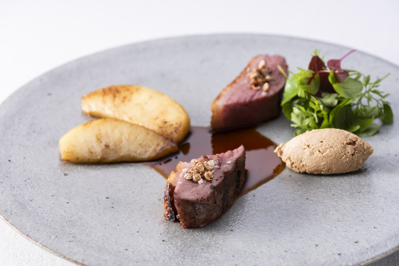 ■牛ロース肉のロースト 黒ニンニクソース レンコンのデクリネゾン