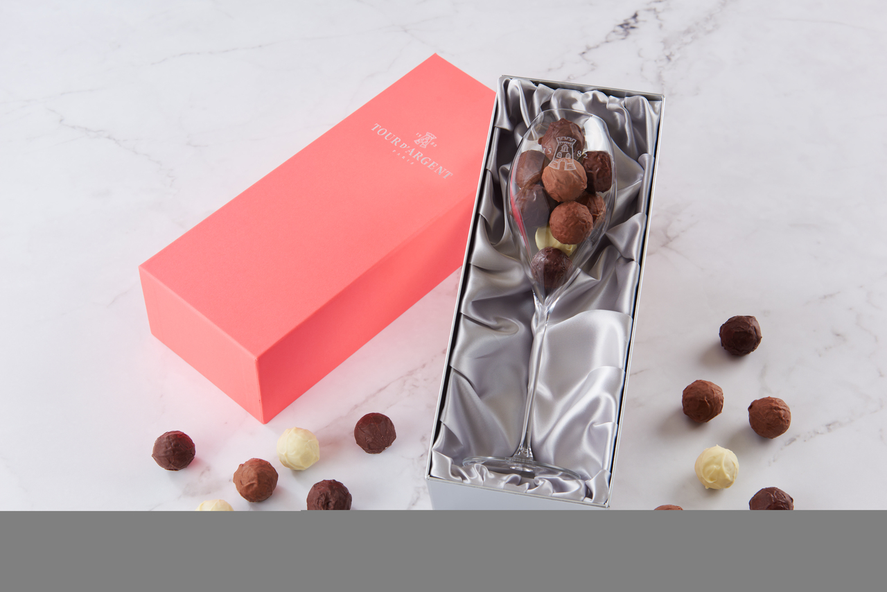シャンパーニュグラスの中に立ち昇る繊細な泡をイメージしたボンボンショコラ。コニャック、プラリネ、苺など季節の味わいをお届けいたします。