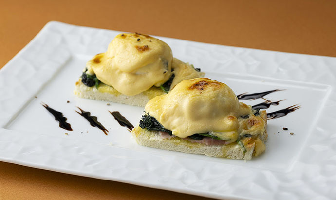 スープ、サラダにその見た目の華やかさと、卵黄の濃厚なコク、オランデーズソースの爽やかな酸味の絶妙なバランスから、「朝食の女王」とも呼ばれているエッグベネディクトにコーヒー又は紅茶が含まれた朝食セットメニューです。