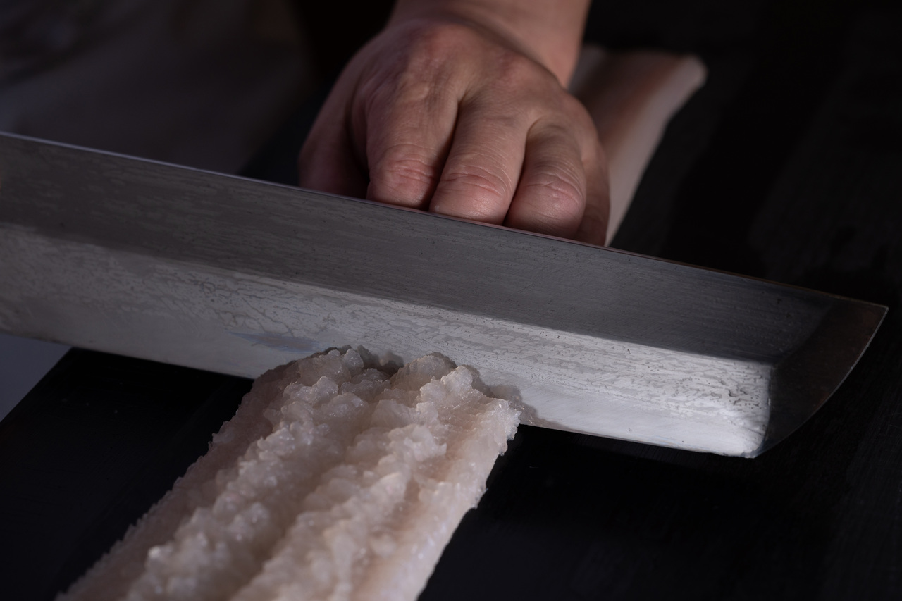 ケヤキの一枚板カウンターに腰を掛け、店主の所作を目の前で感じながら