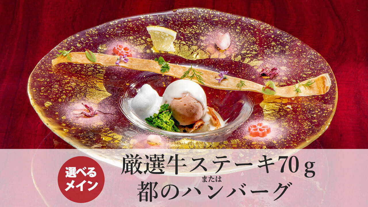 旬のお魚と選べるメイン肉料理(都厳選牛又は都プレミアムハンバーグ)を楽しめます。