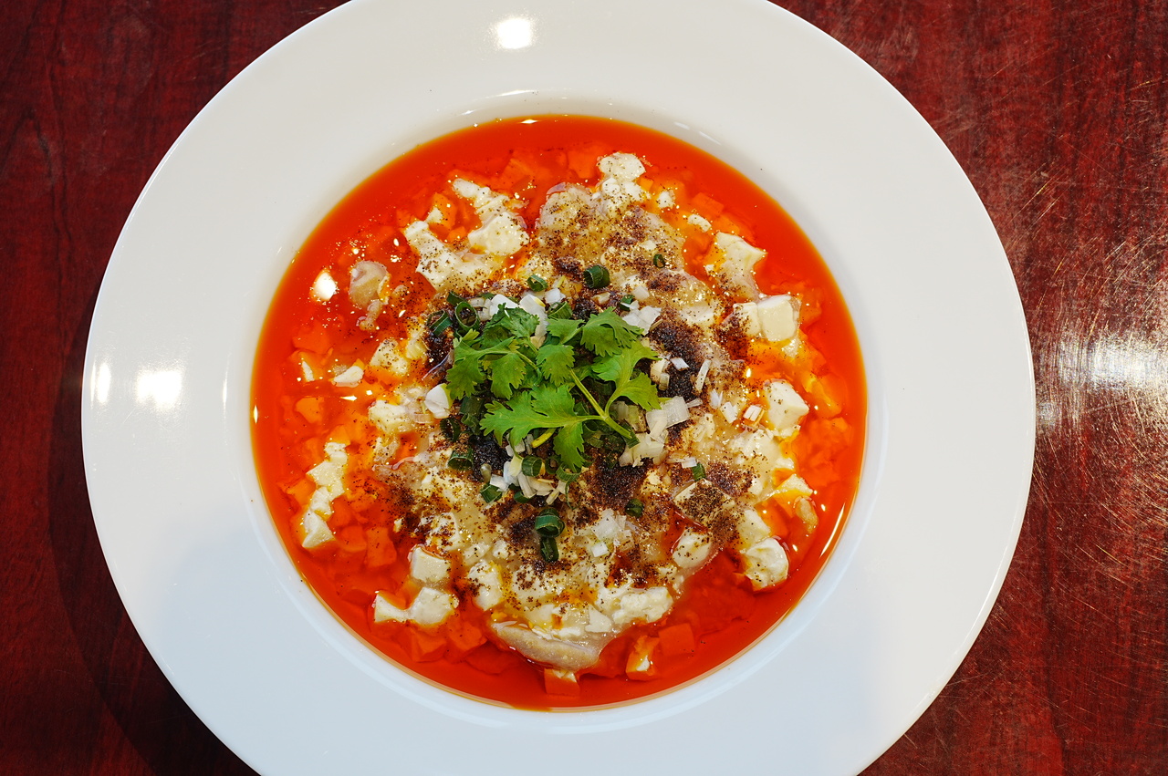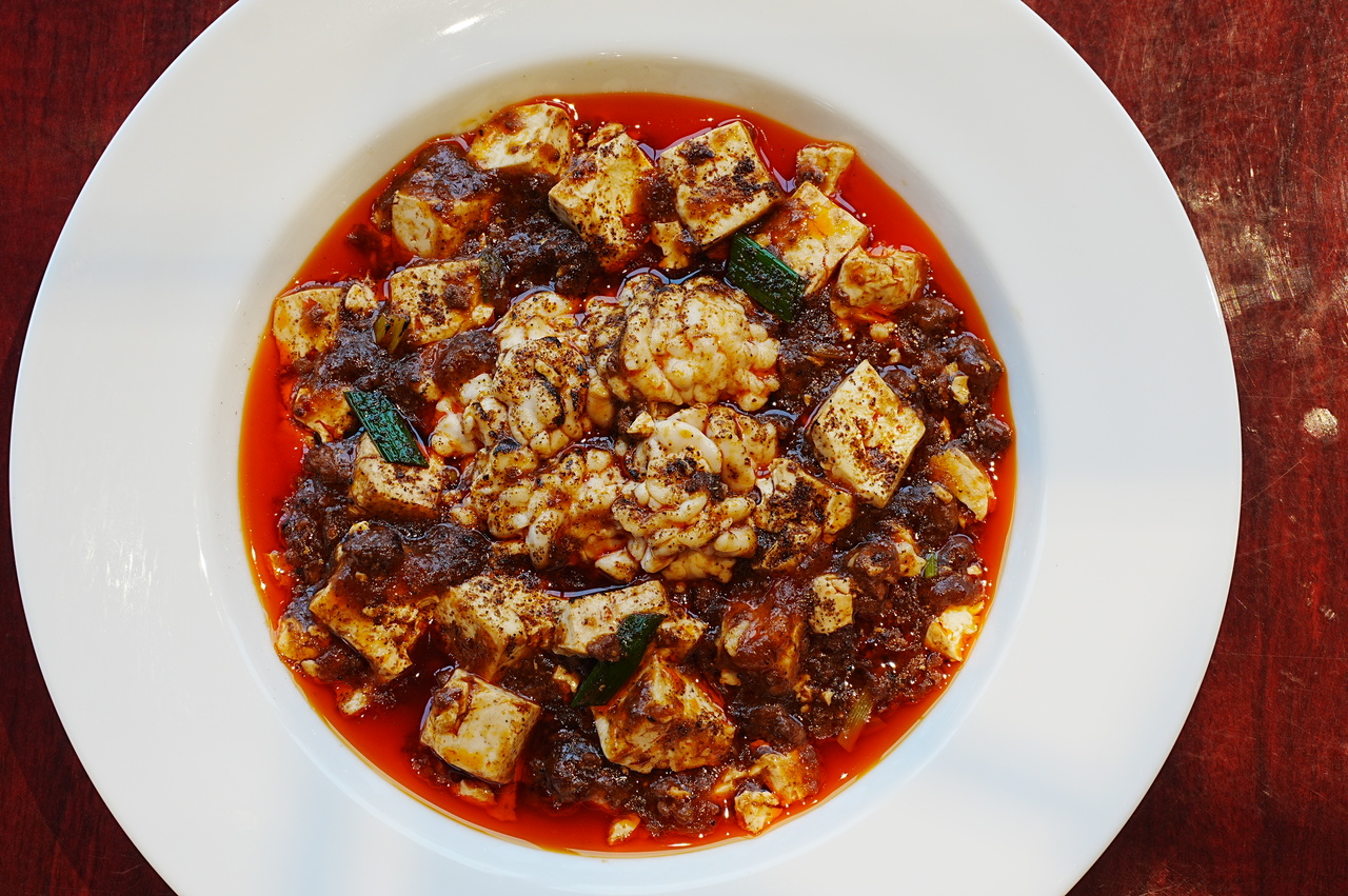 塩味で煮込んだ豚肉と豆腐を四川山椒と朝天唐辛子で辛味を加え、熱した油をかけて香りを立たせた痺れる辛さが味わえる一品。