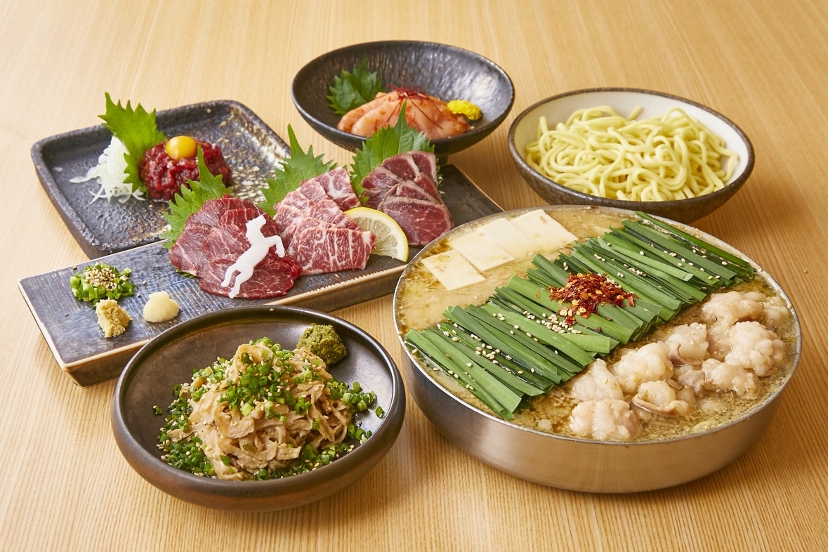 当店自慢の看板商品「博多もつ鍋」をはじめ、牛の希少部位を使用したサイドメニュー一番人気の「柔らか牛すもつ」、粒がはっきりとした厳選一本ものの「おおやま謹製博多明太子」、本場熊本直送の最高級品「馬刺し三種盛り合わせ」、2段階殺菌工程を行い生食感に近く安心・安全にお召し上がりいただける「生食感 和牛ユッケ」から〆の麺までついた、おおやまこだわりの逸品がすべて味わうことのできるお得なセットメニュー。