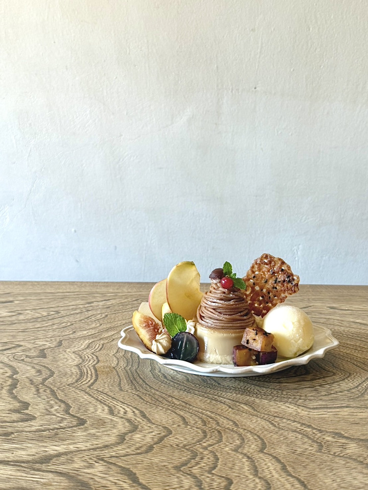 なめらかなほうじ茶プリンにモンブランクリームを絞り、柿やぶどうなどの秋のフルーツを合わせました!
