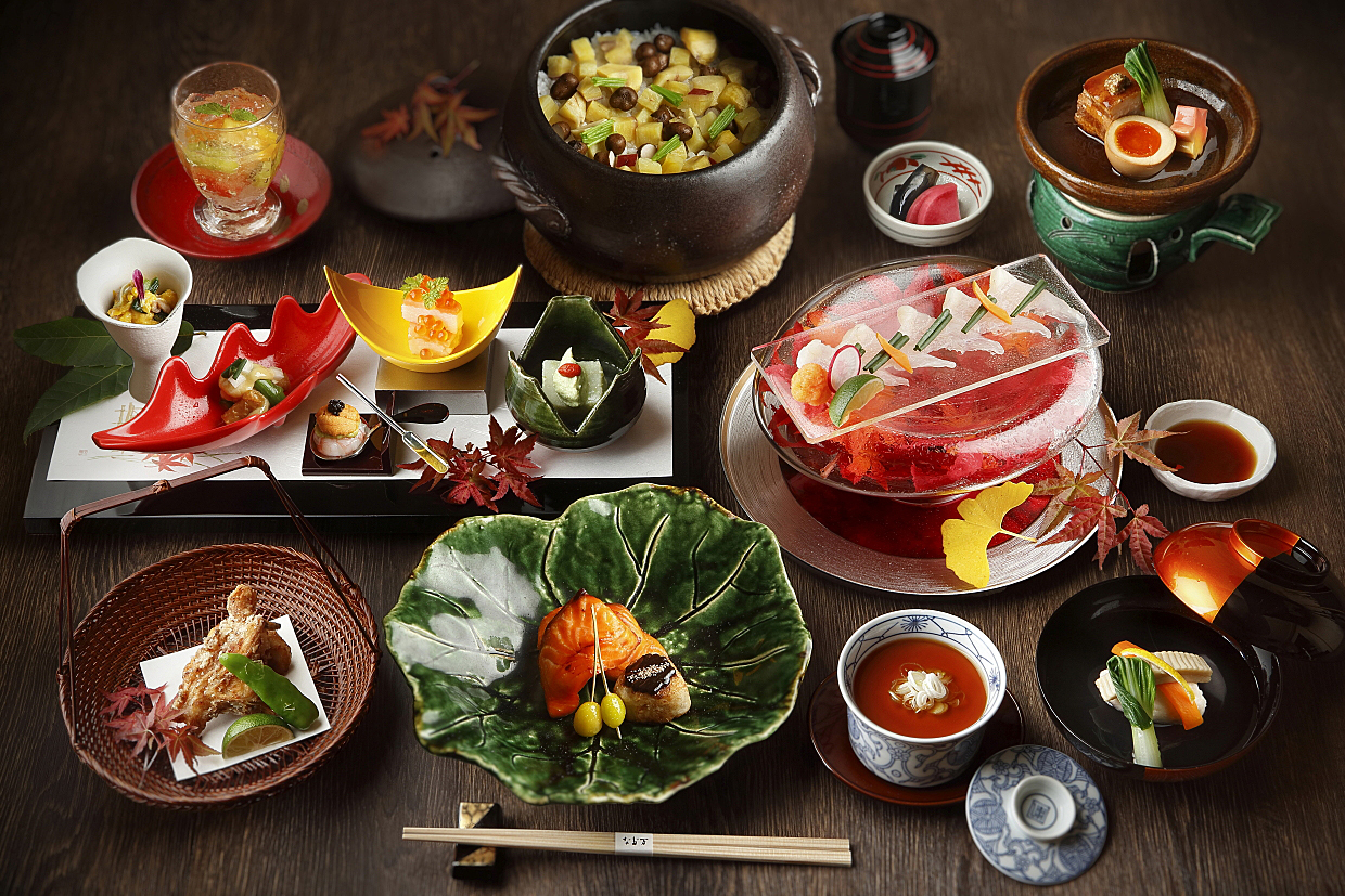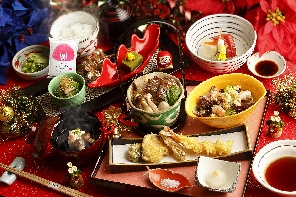 旬菜、吸物、造り、御膳(焼魚、揚げ物、肉料理)、白御飯、香の物、味噌椀