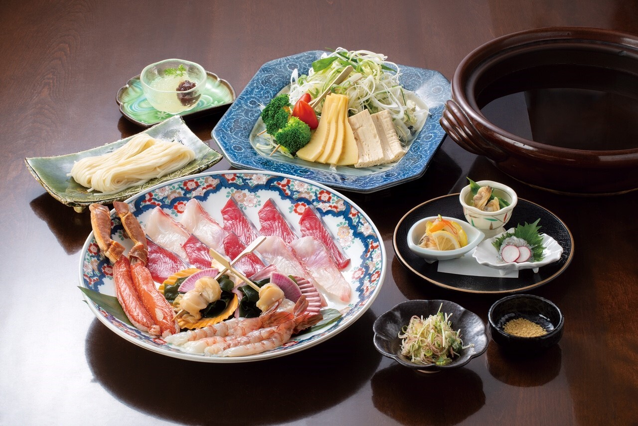 ズワイガニ・海老・クエなどの極上海鮮と祢保希自慢の厳選A5ランク黒毛和牛のしゃぶしゃぶをお楽しみいただけます。