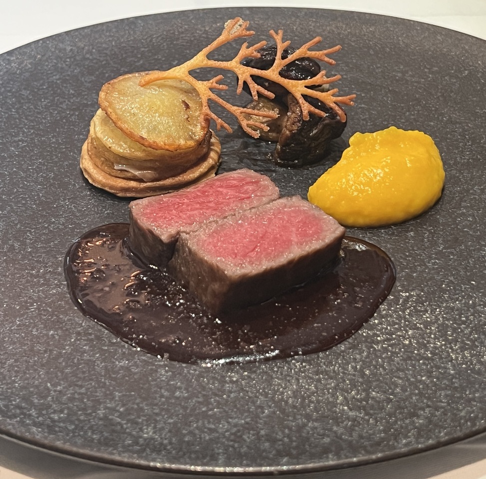 前菜は2皿。人気のフォワグラ料理と旬の食材をふんだんに使ったお任せのお料理と、メインには朝市から仕入れた鮮魚料理と黒毛和牛A5肉のロティールのダブルメインコースです。