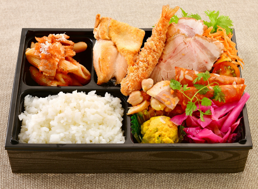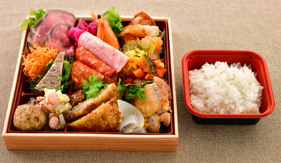 前菜からパスタ、メインまで彩り豊かなおかずが9種類詰まったお弁当。幅広いシーンでご利用いただけます。ご飯が別容器でセットに含まれております。