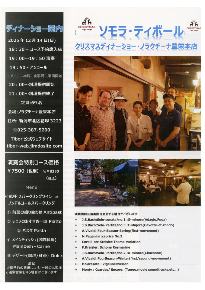12/14(日)限定!バイオリン生演奏ディナーコース(ご予約制)