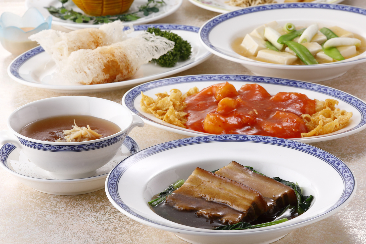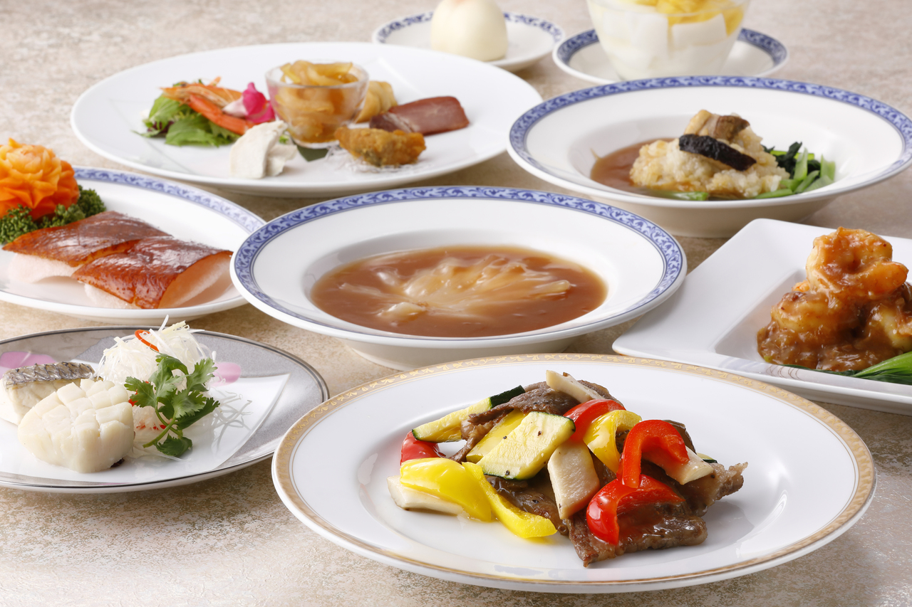 前菜七種盛り合わせに始まり、ふかひれの姿煮、北京ダック、和牛、なまこと鮑など全8品の最高級の食材を使用したメニューです。