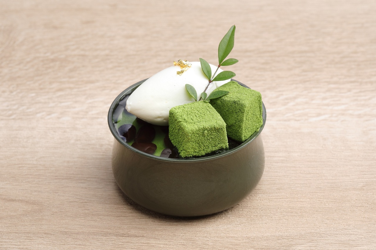抹茶の上品な苦みが活きた濃厚でなめらかな抹茶プリンに大納言小豆入り寒天ゼリーを流し、抹茶わらび餅と生クリームをトッピングしました。抹茶の風味が口いっぱいに広がる、抹茶好きにはたまらない和テイストのスイーツです。