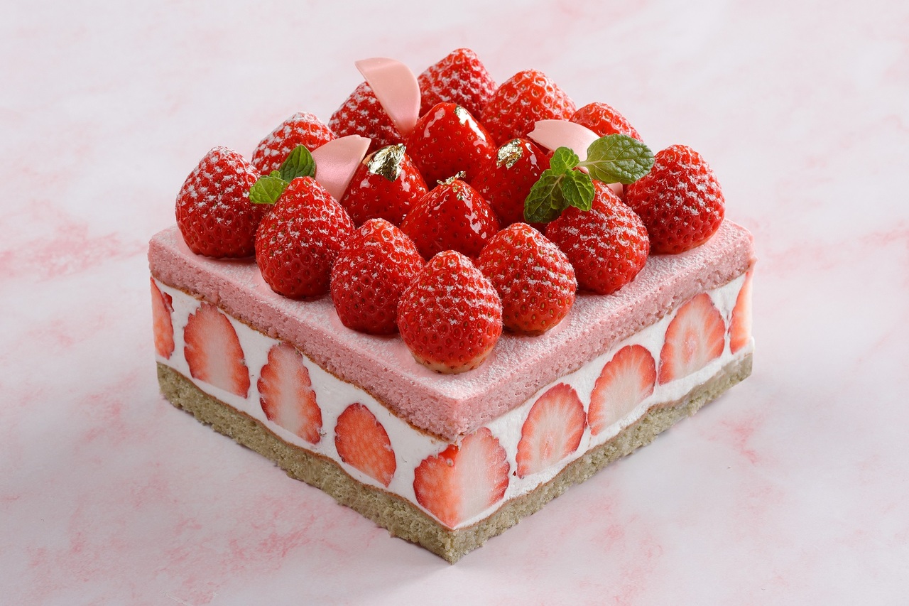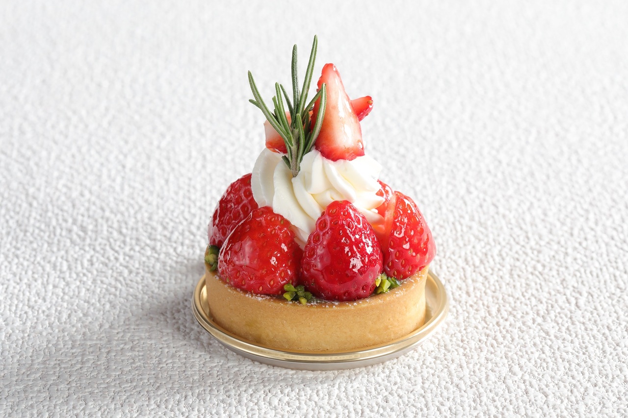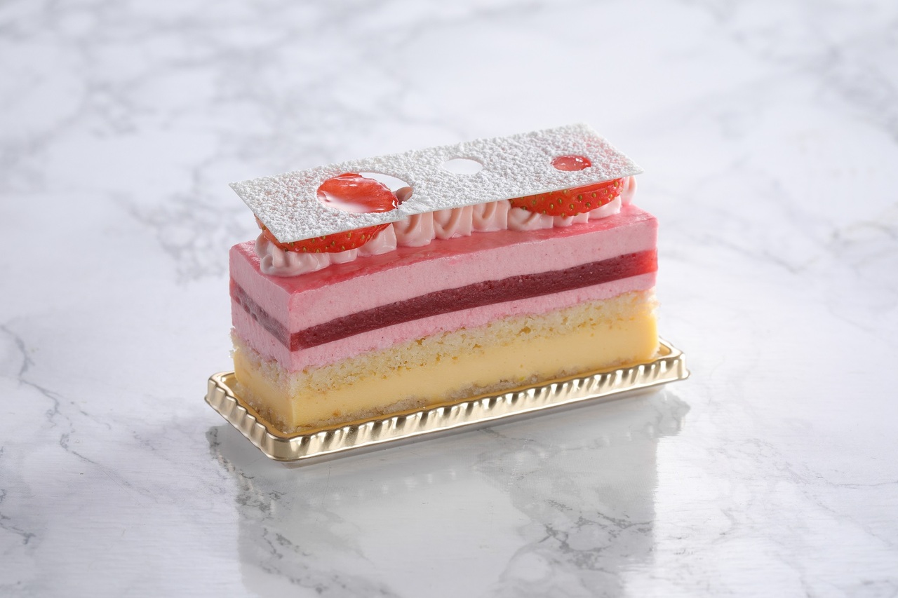 いちごをふんだんに使用した、見た目も華やかなフランス版ショートケーキ。キルシュ風味のまろやかなカスタードクリームとフレッシュないちごをピスタチオ生地でサンドしました。